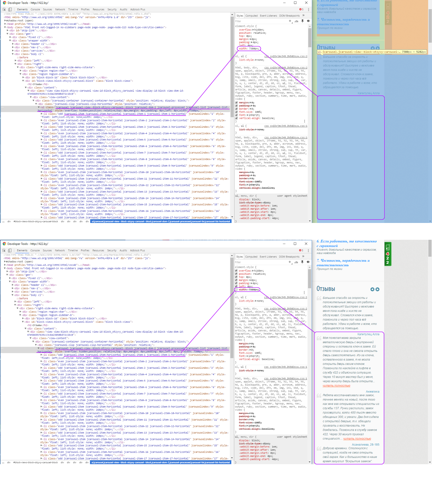 Issue descriptionUserAgent: Mozilla/5.0 (Macintosh; Intel Mac OS X 10_11_4) AppleWebKit/537.36 (KHTML, like Gecko) Chrome/49.0.2623.110 Safari/537.36 Example URL: http://422.by/ Steps to reproduce the problem: 1. Open http://422.by/ 2. Scroll to the bottom of a page 3. Refresh the page, while page refreshes, scroll or use scroll bar. STR Video: https://www.youtube.com/watch?v=DtsWMeSDecg&feature=youtu.be What is the expected behavior? Pare refreshes as usual, page layout remains the same. What went wrong? If you scroll when the page is refreshing wrong CSS parameters will be applied to an element (in this case - wrong styles were applied to "Reviews" section of a website - https://goo.gl/mKlaQh). If you don't scroll when the page loads - issue will not appear. Issue is not reproducible in Canary. Does it occur on multiple sites: N/A Is it a problem with a plugin? Yes jcarousel jQuery plugin Did this work before? Yes M48 Does this work in other browsers? Yes Chrome version: 49.0.2623.110 Channel: stable OS Version: OS X 10.11.4 Flash Version: Shockwave Flash 21.0 r0 Issue can't be reproduced on FF or Edge, this used to work in M48.