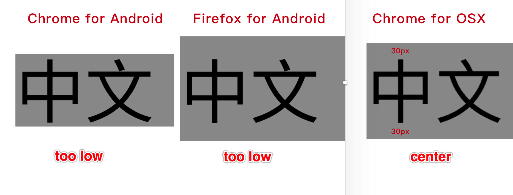 Sorry, i added background-color in the new demo, and you can see Chinese is not vertical center. And here is a compare image (lang="zh" & no font-family): https://img.alicdn.com/tfs/TB1mGyEfRfH8KJjy1XbXXbLdXXa-1730-658.png This is the online page of Snip20171128_489.png : https://chaoshi.m.tmall.com